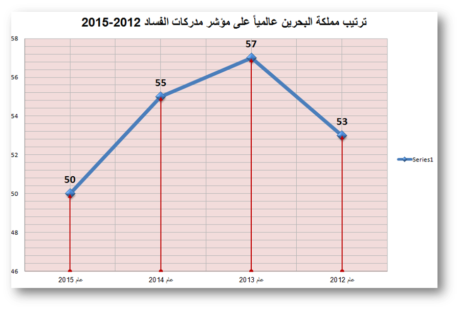 جاء ترتيب مملكة البحرين على مؤشر مدركات الفساد لعام 2015م في المرتبة (50) عالمياً من أصل 168 دولة بدرجة 51 ، مقارنةً بعام 2014م والتي حققت فيها المملكة المرتبة (55) عالمياً بدرجة 49.