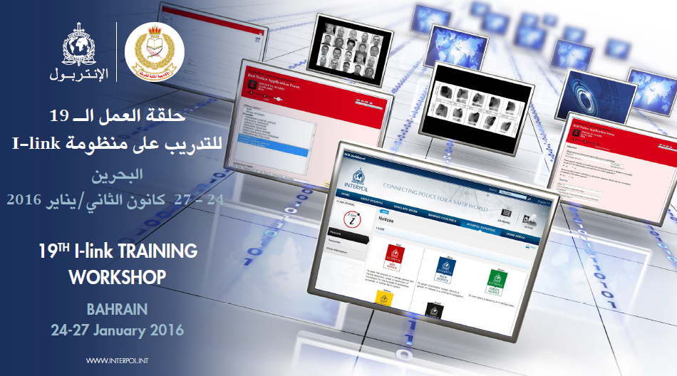 في اطار التعاون المشترك بين المنظمة الدولية للشرطة الجنائية والأكاديمية الملكية للشرطة بالبحرين نظمت بتاريخ كانون الثاني/ 24 – 27 يناير 2016 ورشة العمل التدريبية التاسعة عشرة لمنظومة I-Link ، حيث شاركت مجموعة من اعضاء الدول المختلفة المشتغلة في مراكز انفاذ القانون والمكتب المركزي الوطني